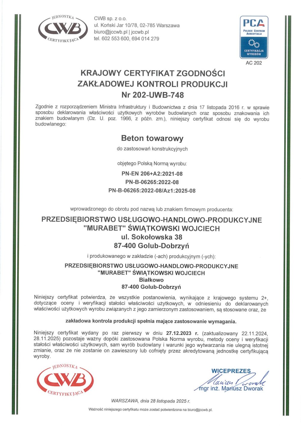 Beton produkowany przez Naszą firmę jest zgodny z najnowszymi normami PN-EN 206+A2:2021-08 oraz PN-B-06265:2022-08